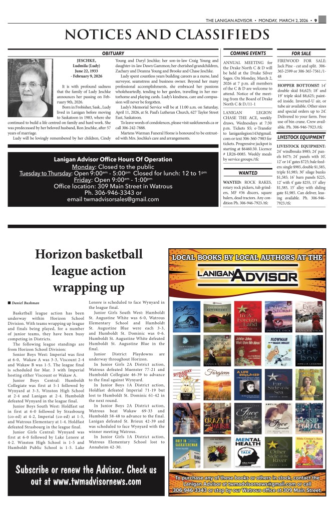 The Watrous Manitou and Lanigan Advisor – two newspapers, once source for local news. Located at 309 Main Street in Watrous. 306-946-3343.